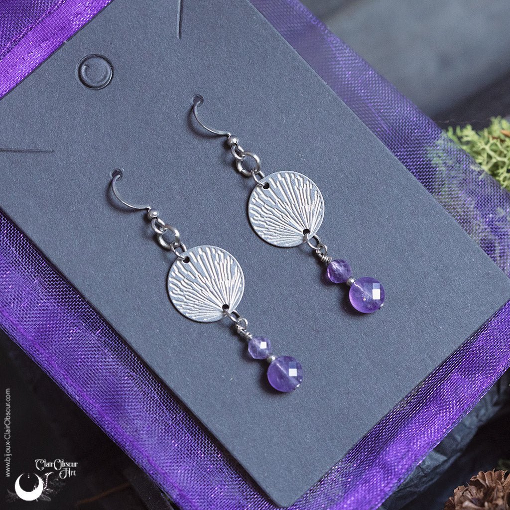Chaque boucle associe une perle d'Améthyste de 8 mm et une perle de 4 mm, suspendues sous une breloque ronde à l’aspect corrodé, en acier inoxydable.