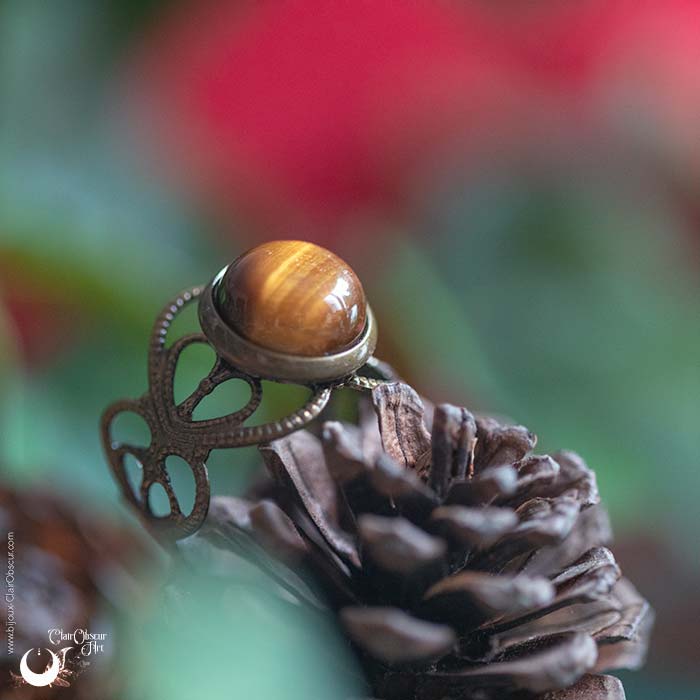 La bague Elwing est une création fantaisie d’inspiration elfique, aux lignes délicates et ajourées. Son anneau fin et léger met en valeur une véritable pierre fine sertie en cabochon, choisie pour sa couleur et ses reflets naturels.
