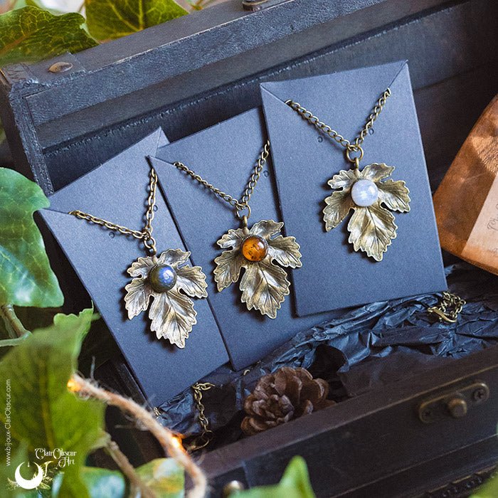 Collier "Aïna" orné d'une véritable pierre, au choix, montée sur un support original représentant une feuille de vigne. En métal (laiton plaqué et vernis) de couleur bronze.