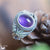 Magnifique bague ajustable "Swan" ornée d'une véritable Améthyste - ouverte au dos, la pierre est ainsi en contact avec la peau et s'ajuste facilement à la taille de votre doigt. Taille de la pierre : 8x10 mm environ.